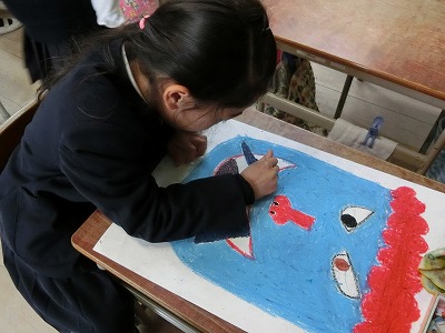 画用紙いっぱいに鬼の絵をパスで描いていました。
