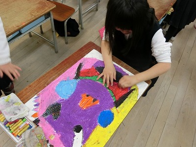 さらに、作品展のときの「ひまわり」で使った「スクラッチ」という技法も取り入れていました。