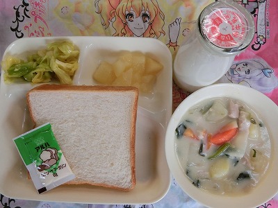 クリームシチューは子どもたちの大好物です。パンをちぎってシチューにひたして食べる子も多いです。どのクラスも食缶は空っぽになっていました。ラッキーニンジンもうれしかったです。