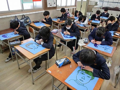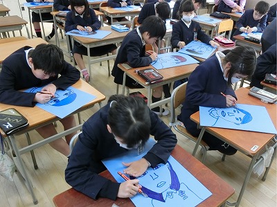 しっかりと説明を聞き、三角刀で顔の輪郭部分を彫っていました。