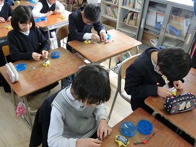 今日は、教科書の内容に無い「じしゃくは電気を通すのか」の学習をしていました。以前に電気を通すもの、通さないものを学習していたので、その発展学習です。