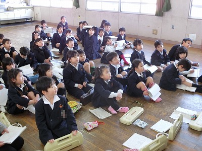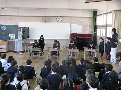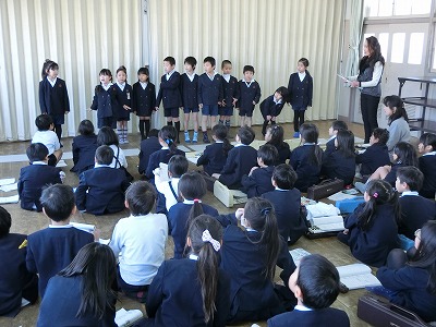 1年生が多目的室で来週の学習参観の練習をしていました。