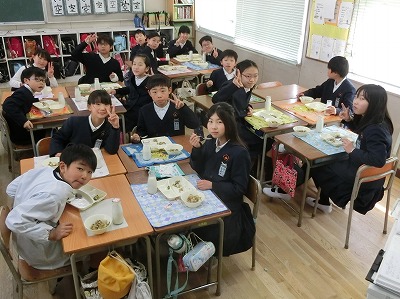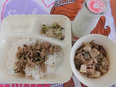 すき焼き煮は、とっても贅沢な献立でした。たっぷりの牛肉に、白菜、とうふ、白ネギ、糸こんにゃく、ふ、まいたけ、が入っていました。すき焼きは大好物です。味付けもしっかりしており、ごはんのおかずにピッタリでした。味の浸みこんだ「ふ」もよかったです。また、中には、ごはんにかけて即席のすき焼き丼にしている子もいました。
