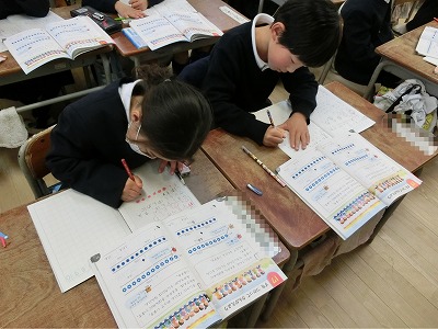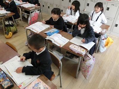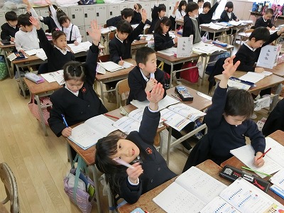 このクラスでは「ずを つかって かんがえよう」という単元に入り、ここでは、文章を読み、その中からキーワードを見つけ出し、式を立て、計算し、答えを導く学習をします。