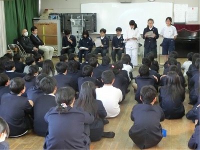 教科や特別教室などの学習面、学校生活、制服や体操服・柔道着、ルール(校則)、年間の主な学校行事、生徒会活動や委員会活動、クラブ活動などについて、寸劇やビデオ映像などていねいに説明していただきました。