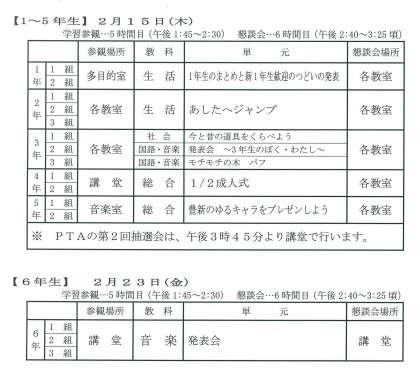 来週の2月15日(木)には1〜5年生で、23日(金)には6年生で、今年度最後の学習参観ならびに懇談会を実施いたします。