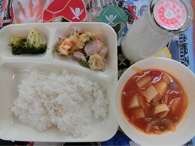 今日の献立は「学校給食献立コンクール優秀賞作品」です。彩りの良い野菜をたくさん使用し、見た目をカラフルにして、苦手な野菜を食べやすくするのが目的の献立です。