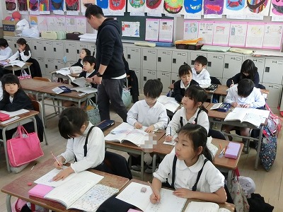 今日の学習のめあては「スイミーに でてきた とうじょうじんぶつを たしかめよう」でした。子どもたちは、どの辺に何が書いているのか分かっているようで、早速、教科書にしるしを入れ、ノートに書き写していました。