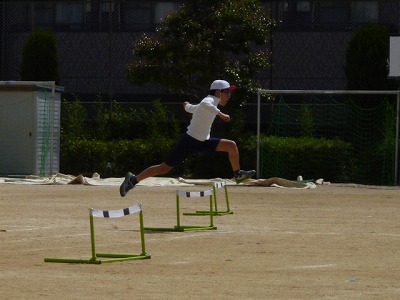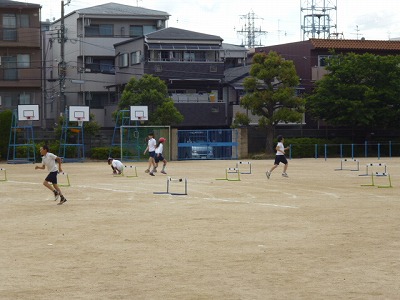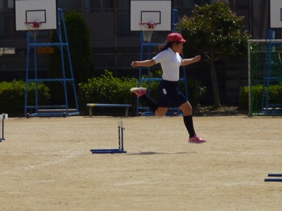 6年2組が運動場で「ハードル」に挑戦していました。