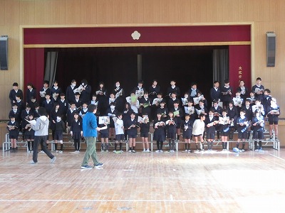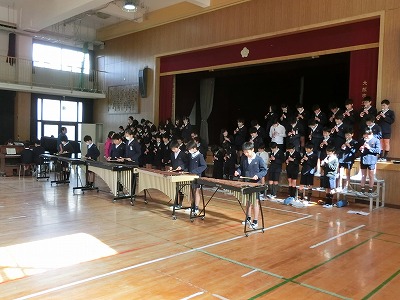 6年生が参観(2月28日に延期しています)に向けて、やっと、はじめて、講堂にて合同練習です。