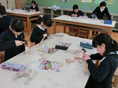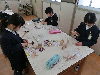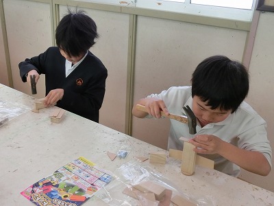 2時間連続の学習でしたが、チャイムが鳴って休み時間になっても、まだ、続けてくぎ打ち作業がしたくて、先生にお願いしていました。