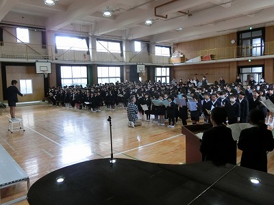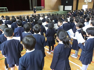 今朝の児童集会は、明日に行われる「6年生を送る会」の練習を1〜5年生で行いました。6年生は教室待機です。