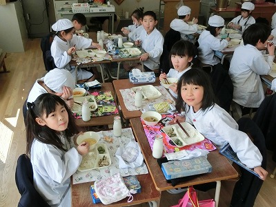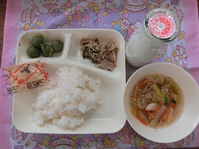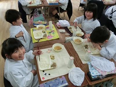 きな粉よもぎ団子は、「葉っぱの味がいやや〜っ!」と言っている子もいましたが、多くの子は喜んで食べていました。一人一袋の「きな粉」も大人気で、お団子にかけるのに余った子は、ご飯にかけておいしそうに食べていました。