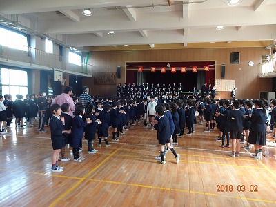 1〜5年生に見送られて、大きな拍手の中、6年生の退場です。