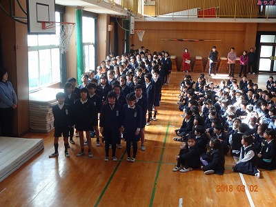 最後は6年生です。参観の時にも披露した「風を切って」の合奏です。心をひとつにした演奏を在校生にプレゼントしてくれました。
