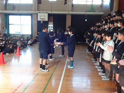 各学年の発表を終え、6年生が自分たちで縫った「ぞうきん」のプレゼントです。
