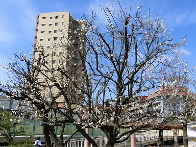 開花のときに紹介をしましたが、豊新には白梅が3本あります。1本は正門玄関右手の給食室前(あまり木は大きくはありません)、2本目はみかん園の文房具屋さん側、3本目は豊新の森、うんていの後ろです。