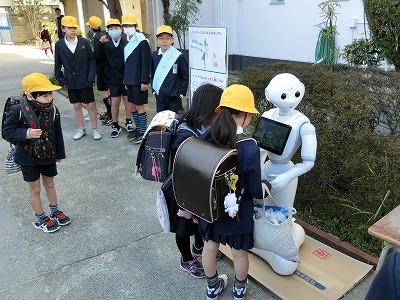 今日は東淀川区の「見守るデー」ですが、昨日に予告した通り、8時から玄関前に、ペッパー君に立ってもらい、登校してきた児童に「おはようございます」の、あいさつをしてもらいました。