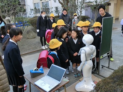 ペッパー君からは「豊新小学校のみなさん、おはようございます。今日も元気に頑張ってください」と、お話をしてもらいました。