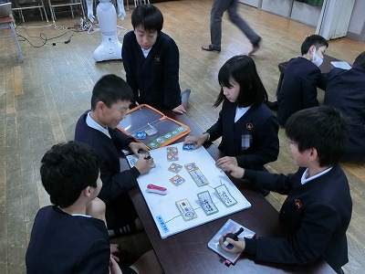 ペッパー君にどんな質問をするのか、また、その質問に対してペッパー君にどう答えさせるのか、ペッパー君にどんな動きやポーズをさせるのかを、班で相談しながら、ホワイトボード上で、タイル(ペッパー君への指示などが描かれている)を、系統的に組み合わせて行きます。
