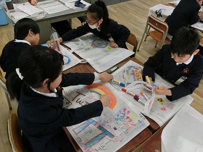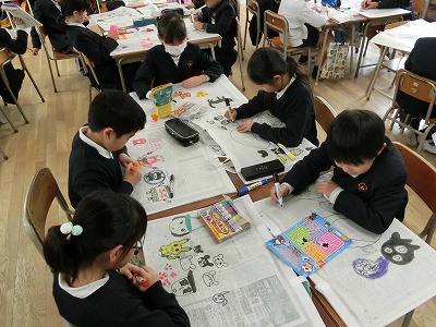 3年生のこのクラスでも、作品袋に絵を描いていました。