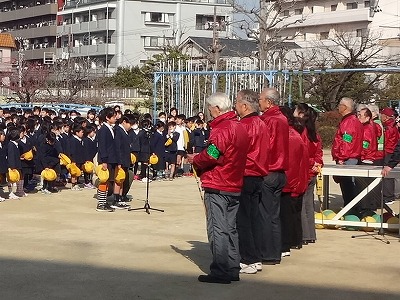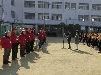 最後に、見守り隊の隊長さんに代表してあいさつしていただき、「卒業、おめでとう。中学校でがんばってください。これからも朝、会ったら、いつもと同じようにあいさつしてくださいね。」と言葉をいただきました。さらに、1〜5年生には、「4月から1年生が入学してきます。仲良くしてあげてください。」と話もありました。