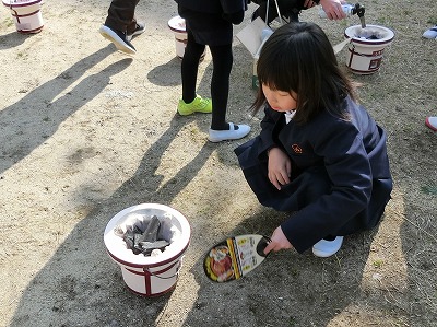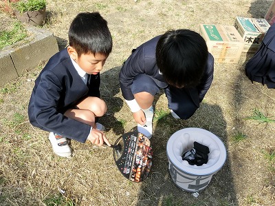 1時間目は準備です。1組さんに手伝ってもらって、七輪を外へ運び出し、炭を入れ、火おこしです。種火を先生に付けてもらって、その後、うちわや下敷きを使って、一生懸命にあおいでもらいました。