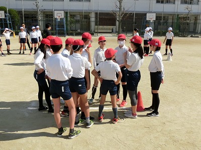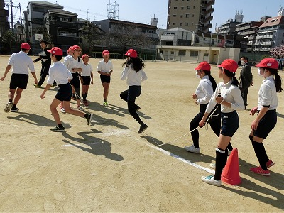 長縄のどのあたりで跳べばいいのか?、縄の長さは?、スピードは? と、意見を出し合ったのですが、2回戦も赤組は敗戦。白組の勝利でした。