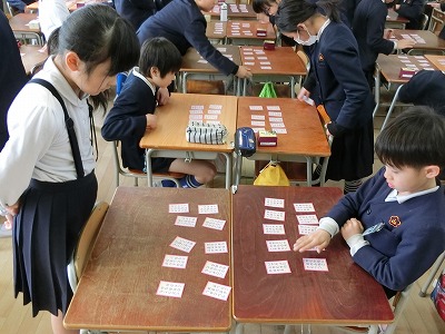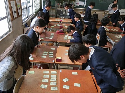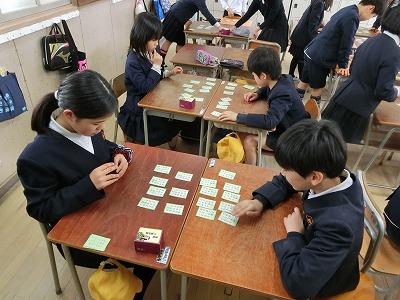 このクラスでは、以前から五色百人一首に取り組んでいて、時間があれば、20枚ずつの2人対戦をしてきました。