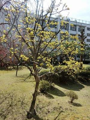 講堂横の芝生広場にあるサンシュユです。