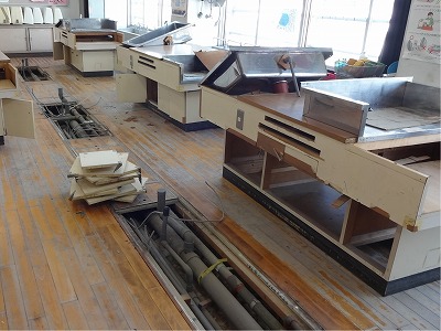昨日に、古い調理台の撤去、配管の整備を行い、本日の朝から、古い調理台の運び出し、新しい調理台の搬入・設置を行いました。