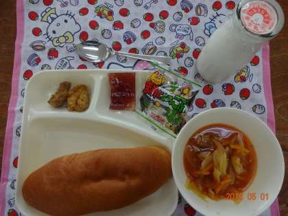 ミネストローネには、鶏肉、キャベツ、たまねぎ、トマト、にんじん、パセリが入っています。子どもたちもたくさん食べていました。