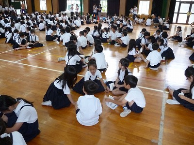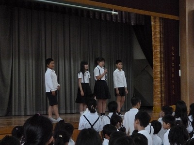 運動場が雨でぬかるんでいるため、児童集会は講堂で行いました。