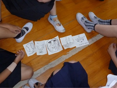 たてわり班のリーダーから一人ひとり絵の描かれたカードを受け取り、自分と違う絵のカードを持った人とグループになっていきます。6人(6種類の違う絵)が集まることを目指しました。