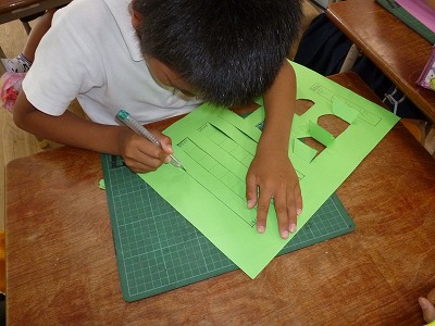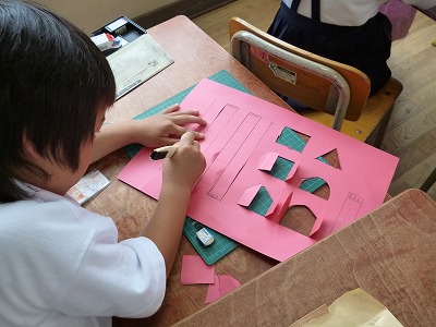 画用紙に書かれた線の通り、カッターナイフで切り込みを入れていきます。