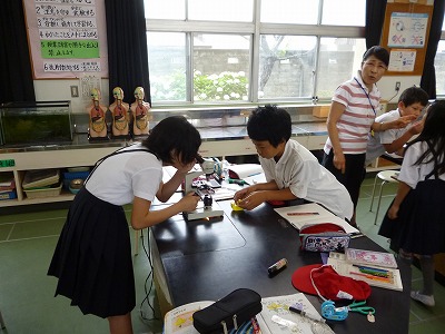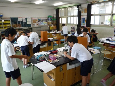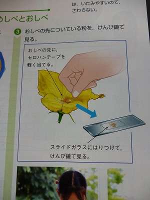 1枚だけでいいのに、好奇心旺盛の子ども達は、アサガオ・オモチャカボチャ・アジサイザクロ・ハーブ・クジャクサボテンなどなど、校内のいたるところから花粉を集めてきて、2枚目・3枚目のプレパラート標本を作っていました。