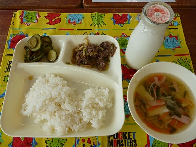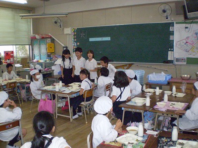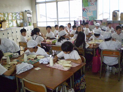 きょうだい学年間(1年生と6年生・2年生と4年生・3年生と5年生)で児童が入れ替わり、異学年で給食を食べました。