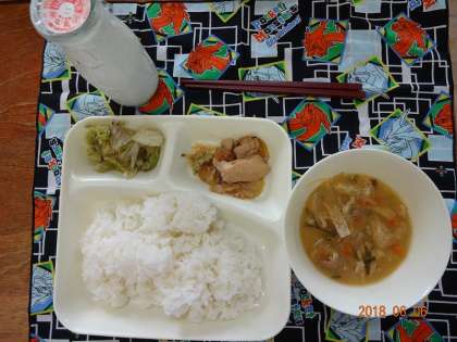 鶏肉の甘辛焼きは、料理酒、砂糖、みりん、こい口しょうゆで味つけされています。甘くて美味しかったです。みそ汁には、豚肉、うすあげ、もやし、にんじん、青ねぎが入っていてとても美味しかったです。ご飯が進みました。