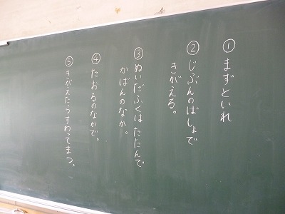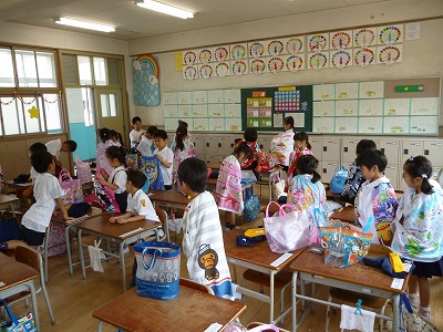 1年生では準備物の確認と、水着へのお着替えの練習をしていました。