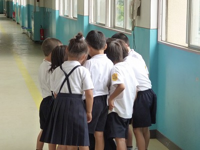 グループで1人が郵便屋さんとなり、廊下で先生に、イラスト内の「〇〇は◇色」という指示を受けます。