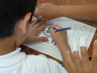 その言葉を、間違えずにグループに伝え、イラストに指示通りの色を塗っていくというものです。