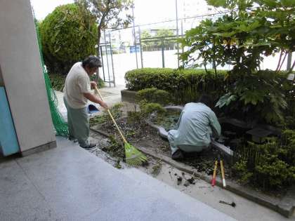 金魚の池のまわりを、管理作業員さんがきれいにしてくれました。