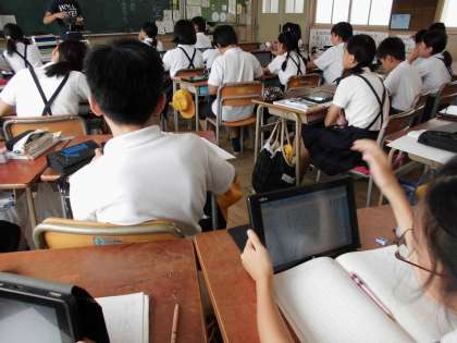 教科書の内容をタブレットに送信し、全員で読みました。