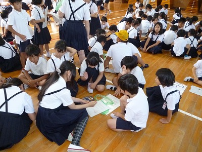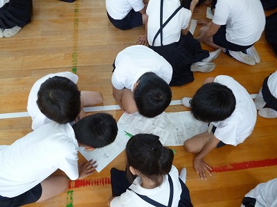 たて割り班の中をさらに4〜6人の小さなグループに分け、土曜日に実施される「豊新フェスティバル」のお店の回る順番を相談しました。