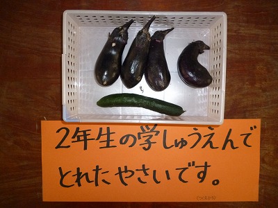収穫したナスとキュウリが2年生の廊下に展示されていました。