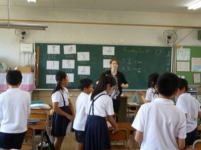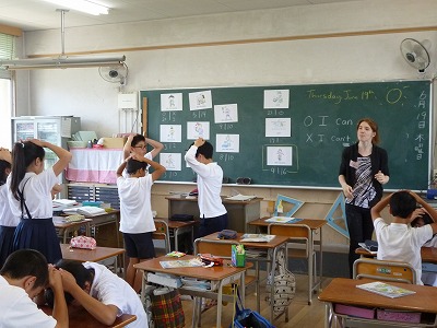 黒板に掲示されたイラストカードを用いて、体を動かしながら、楽しく学習を進めていました。