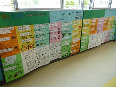 2年生が、去る5月28日に実施した「校区たんけん」の様子をレポートや新聞形式にきれいにまとめて、廊下に掲示しています。(写真は2年1組と2組の前です)