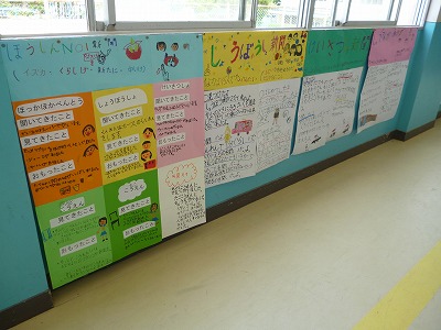 また、教室内や、階段踊り場などの掲示板にも、各学年ごとの書写や図工の作品が掲示されています。授業での成果を見てあげてください。
