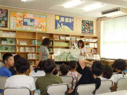 「がらがらどん」による『夏休みおはなし会』が10時から図書室でありました。また、今日は「東淀川区絵本読み聞かせ事業」よりボランティアさんもお手伝いに来てくださりました。