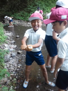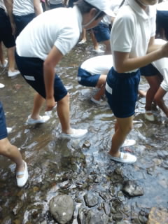逃げる魚を追いかける子どもたち。沢の水はとても冷たくしびれてきました。